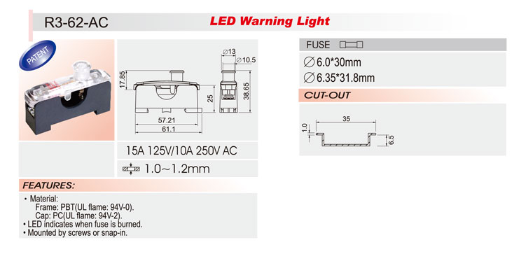 6*30軌道安裝保險絲座 R3-62 15A250V