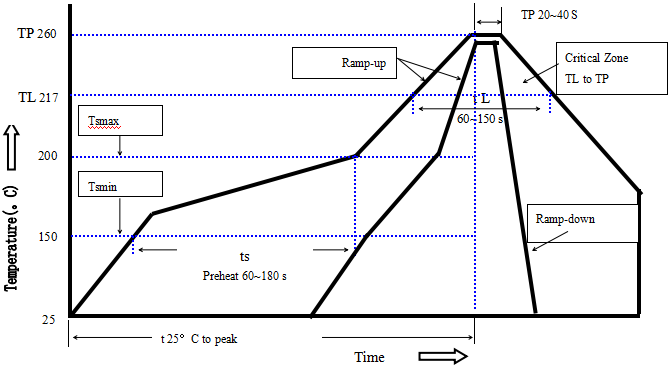Recommended reflow methods: IR, vapor phase oven, hot air oven, N2 environment for lead-free Recommended maximum paste thickness is 0.25mm Devices can be cleaned using standard industry methods and solvents. Note 1:All temperature refer to topside of the package, measured on the package body surface. Note 2: If reflow temperatures exceed the recommended profile, devices may not meet the performance requirements.
